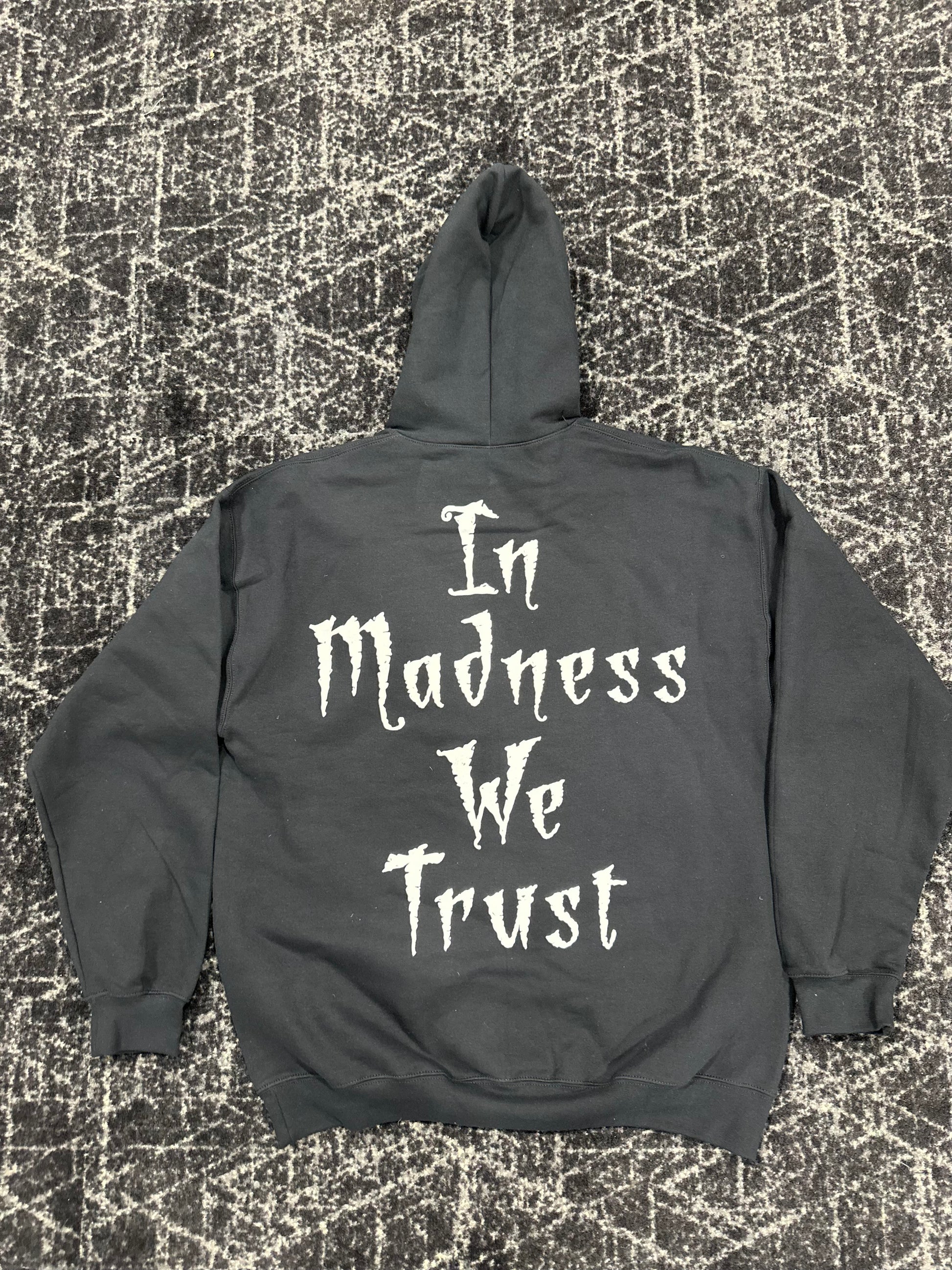 Our iconic Mad Cat design on the front of the hoodie, with “In Madness We Trust” on the back.